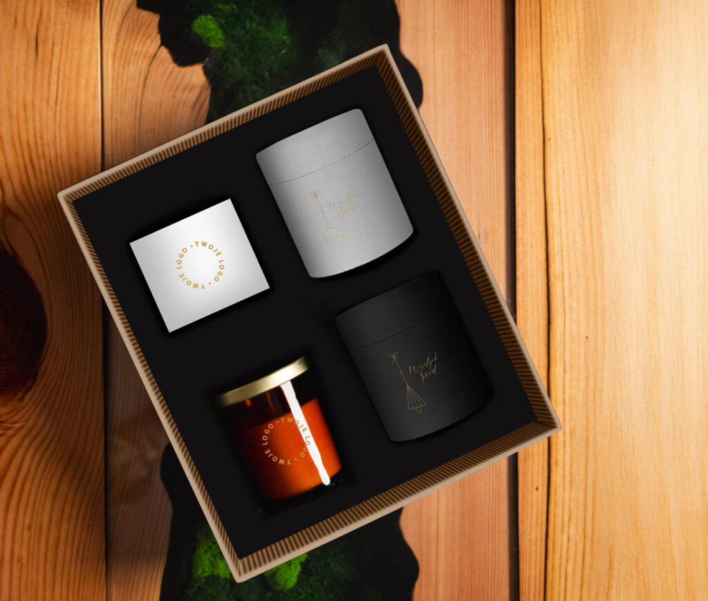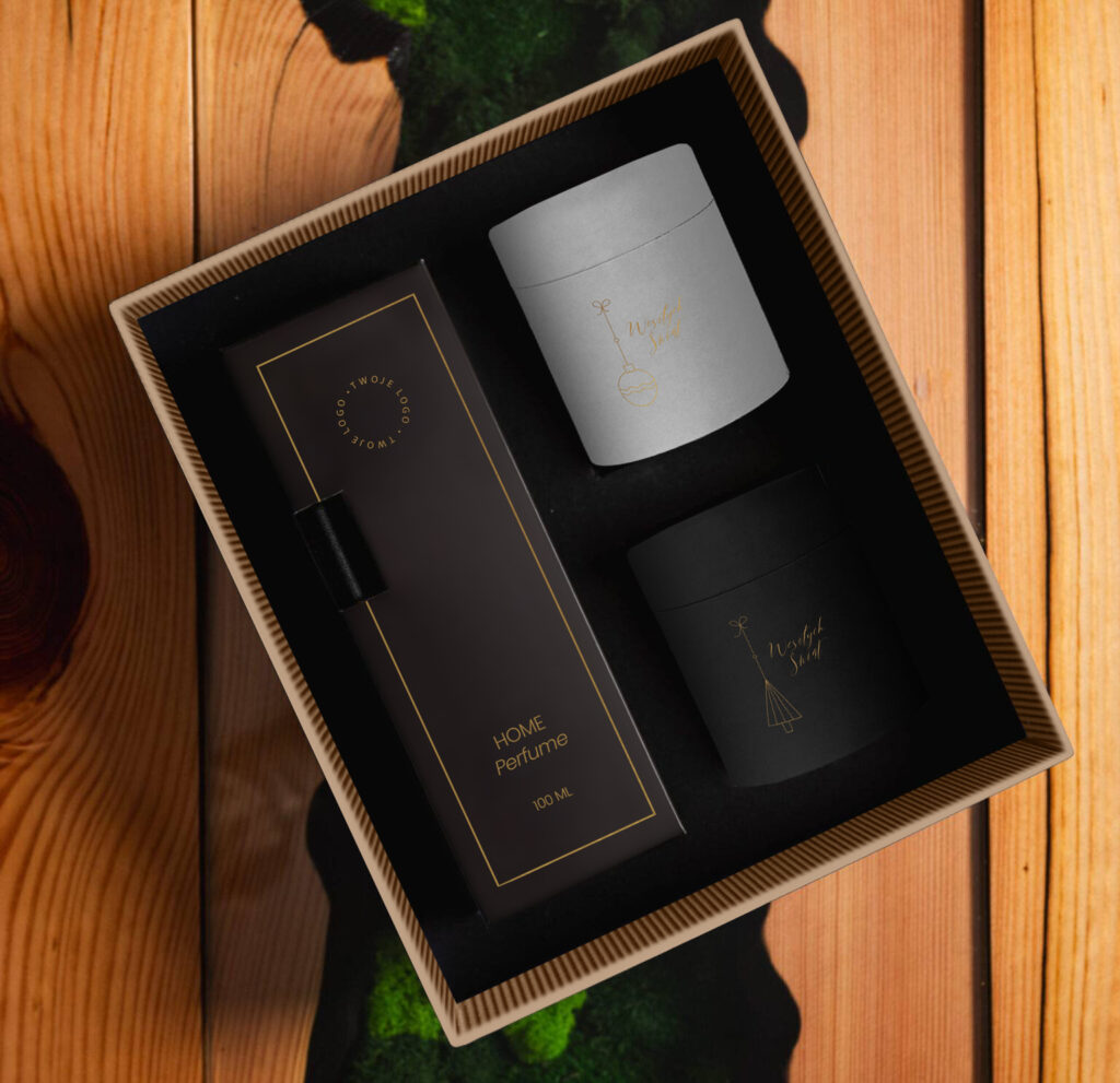 Skład: personalizowany dyfuzor, dwie personalizowane świece sojowe